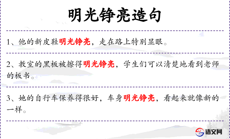 - 明光铮亮:形容词短语,形容物体表面非常光亮,反射出明亮的光芒。