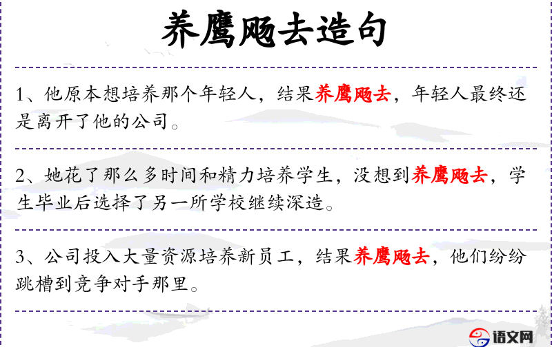 - 成语典故:“养鹰飏去”出自《左传·僖公二十八年》,比喻培养人才却未能如愿。