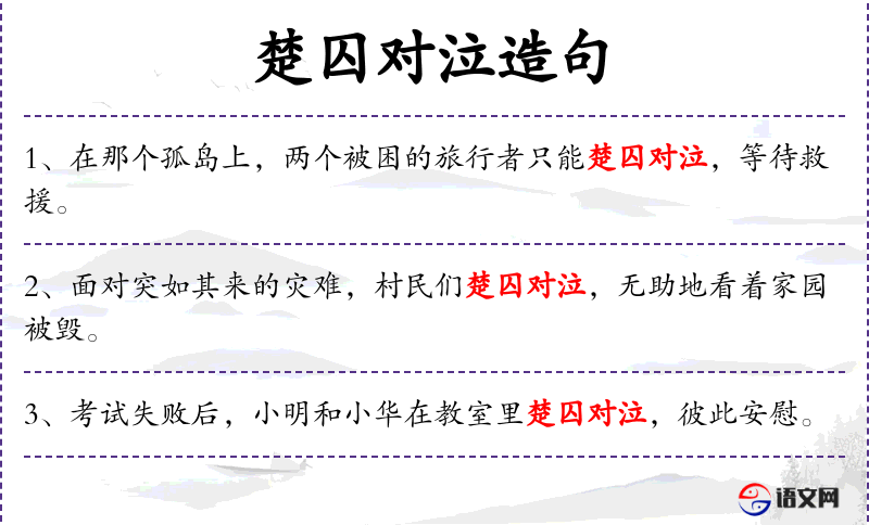 1. 【楚囚对泣】 - 楚囚:原指被俘到晋国的楚国人,后泛指处于困境,无计可施的人。比喻在情况困难、无法可想时相对发愁。