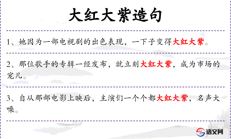 - 大红大紫:在**文化中,红色和紫色象征着繁荣和尊贵,常用来形容事业或名声的兴旺。