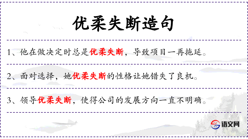 - 优柔失断:形容词短语,形容一个人犹豫不决,缺乏果断。