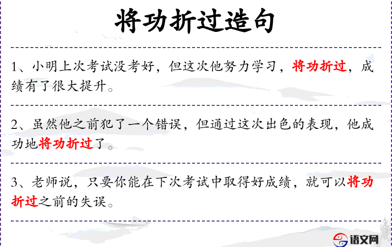 - 将功折过:成语,意思是通过努力弥补过去的错误或不足。