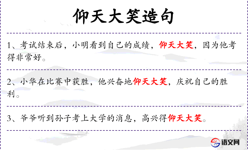 - 仰天大笑:动词短语,表示庆祝的方式。 *. 庆祝:动词,表示为了纪念或表达喜悦而进行的活动。