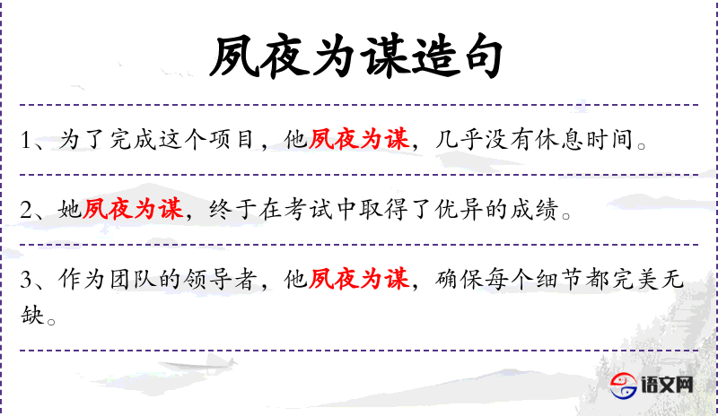- 成语:“夙夜为谋”体现了**文化中对勤奋和努力的重视。