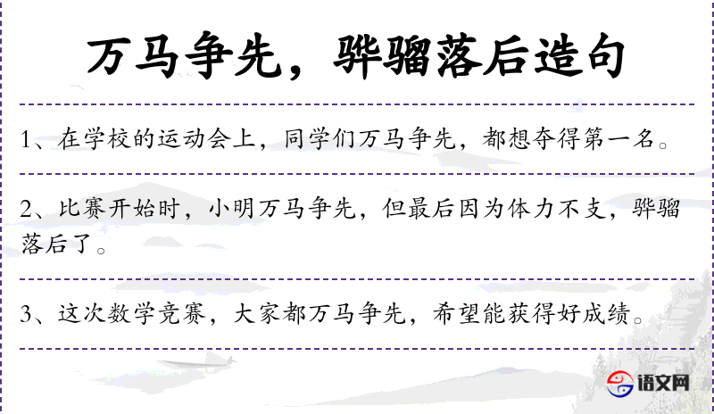 句子:“在这次演讲比赛中,小红万马争先,但因为紧张,最后骅骝落后了。”