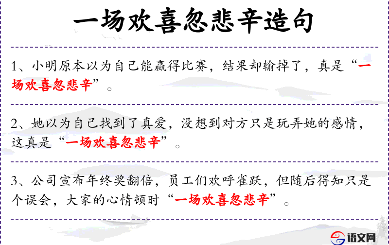 1. 【一场欢喜忽悲辛】 忽:突然。一场欢喜之事忽然变为悲痛之事。比喻人生悲喜不定,难以预料。
