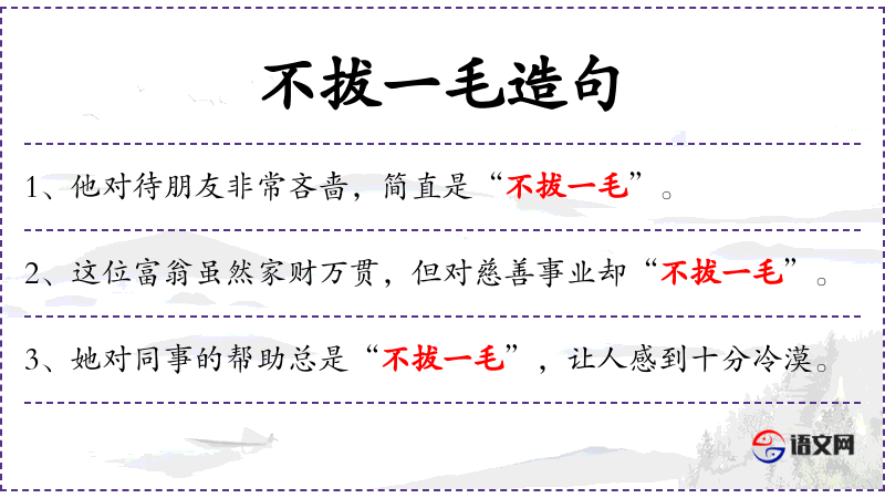 1. 【不拔一毛】 - 比喻非常吝啬。同“一毛不拔”。