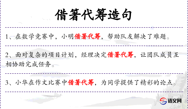 句子:“在数学竞赛中,小明借箸代筹,帮助队友解决了难题。”