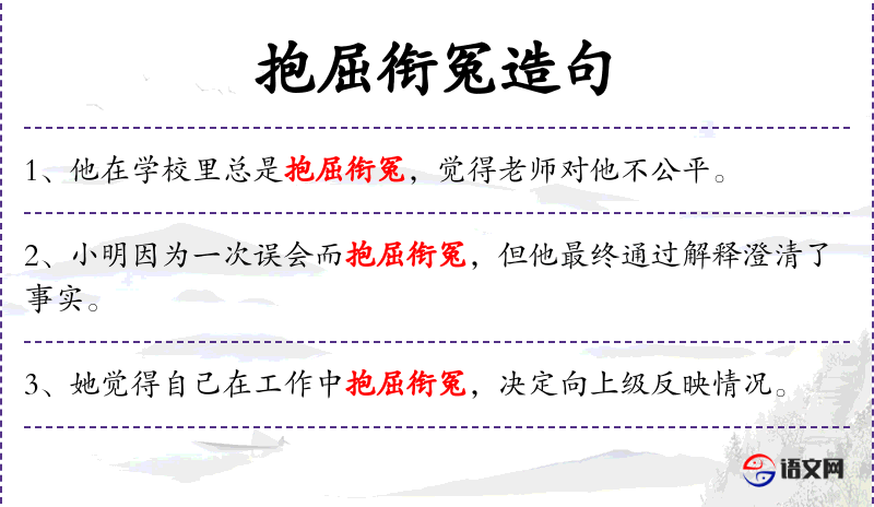- 成语、典故:“抱屈衔冤”是一个成语,源自古代文学作品,用来形容受到不公正对待时的情感状态。