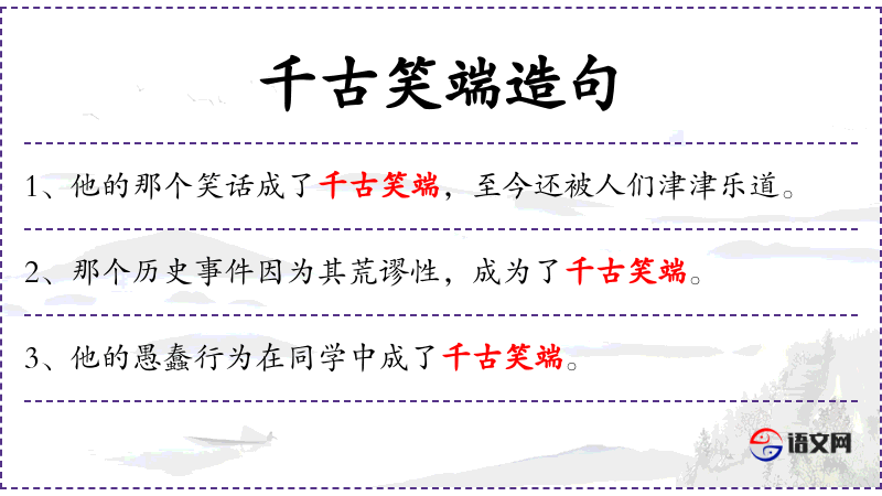 “千古笑端”可能蕴含着文化中对幽默和笑话的重视。在**文化中,幽默和笑话常常被用来缓解紧张气氛、增进人际关系。了解相关的成语和典故,如“津津乐道”,可以加深对句子文化背景的理解。