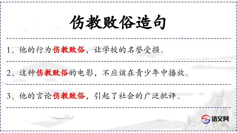 - 伤教败俗:指违背教育原则和道德规范的行为。