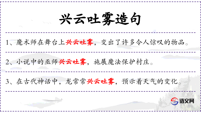 - 兴云吐雾:形容龙活动时的景象,比喻龙在神话中的能力。