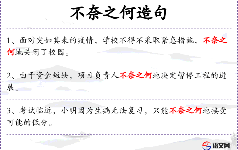 - 状语:因为丢失了重要的笔记,不奈之何地