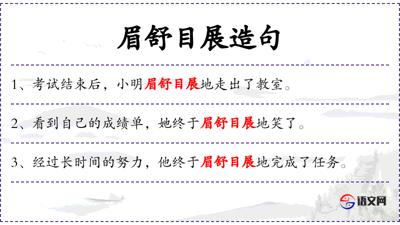 3. 【眉舒目展】 - 展:伸张。形容神采飞扬,精神振奋。