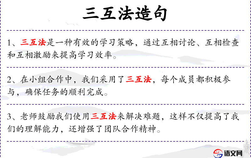 在小组合作中,我们采用了三互法,每个成员都积极参与,确保任务的顺利完成。