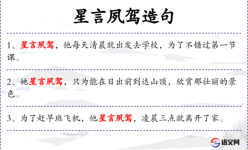 1. 【星言夙驾】 言:语助词,无义;夙:早。星夜驾车行驶。