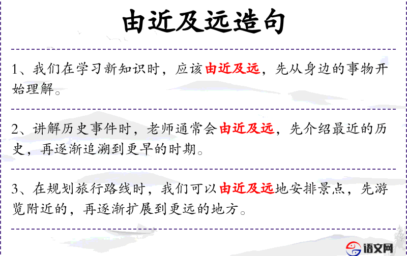 6. 【由近及远】 从近处到远处。比喻事物的影响逐渐推广,思想认识不断深入。