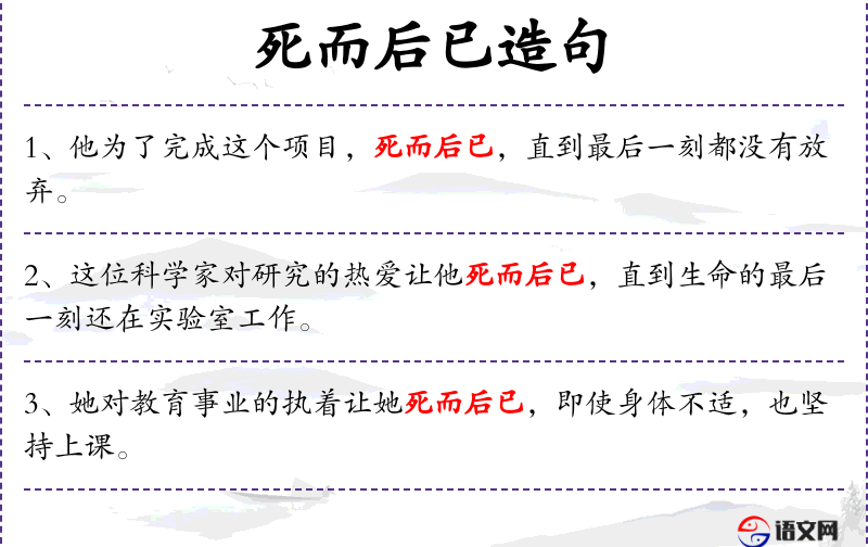 5. 【死而后已】 已:停止。死了以后才罢手。形容为完成一种责任而奋斗终身。