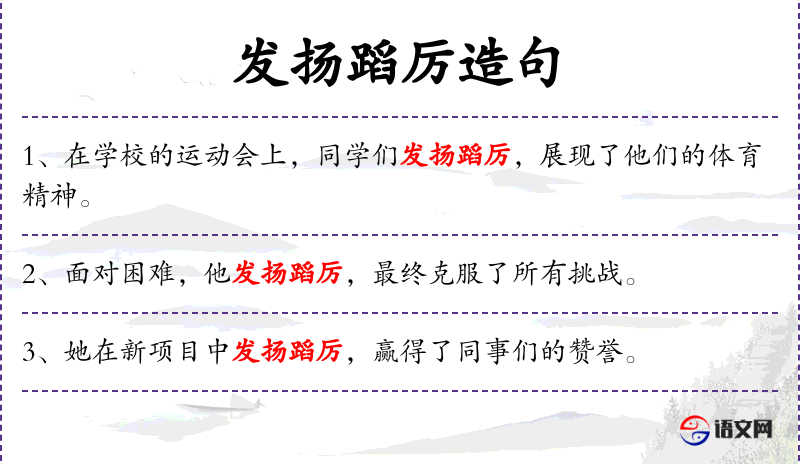 - 发扬蹈厉:这个成语源自《左传·僖公二十五年》,原意是指舞蹈时动作激烈,后引申为形容人奋发有为,努力进取。