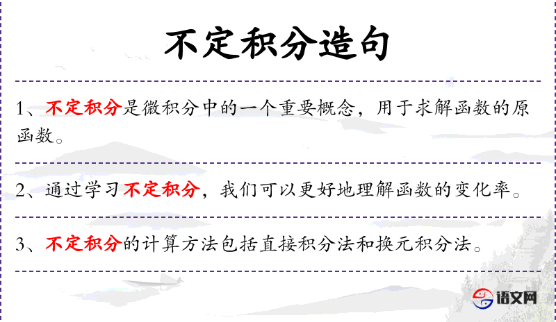 2. 【不定积分】 微积分的重要概念。如果在区间i内,f′(x)=f(x),那么函数f(x)就称为f(x)在区间i内的原函数。原函数的一般表达式ゝ(x)+c(c是任一常数)称为f(x)的不定积分,记作ИА襢(x)dx=f(x)+c,ИР⒊苀(x)为被积函数,c为积分常数。