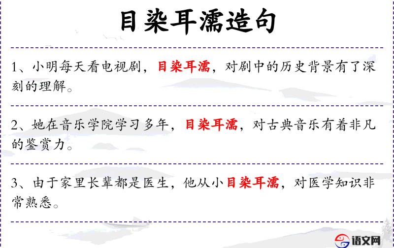 4. 【目染耳濡】 - 染:沾染;濡:沾湿。眼睛经常看到,耳朵经常听到,不知不觉地受到影响。