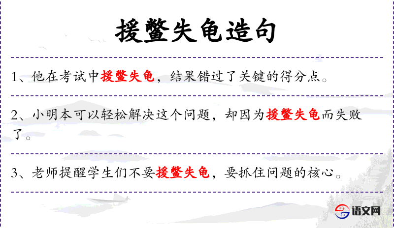 句子出现在体育比赛的背景下,教练在比赛前对员进行提醒和鼓励。这里的“援鳖失龟”是一个成语,用来告诫员不要因为小失误或小利益而影响整体表现。