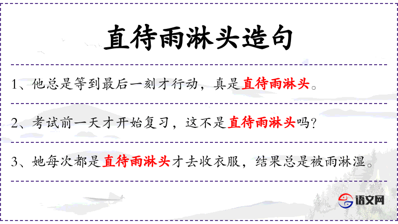 1. 【直待雨淋头】 - 待;等到。直到下雨时方要做某事。比喻不能及早动手或毫无准备。