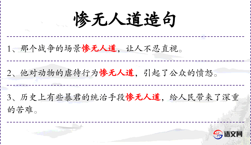 1. 【惨无人道】 惨:狠毒,残暴。残酷狠毒到极点,如野兽一样。