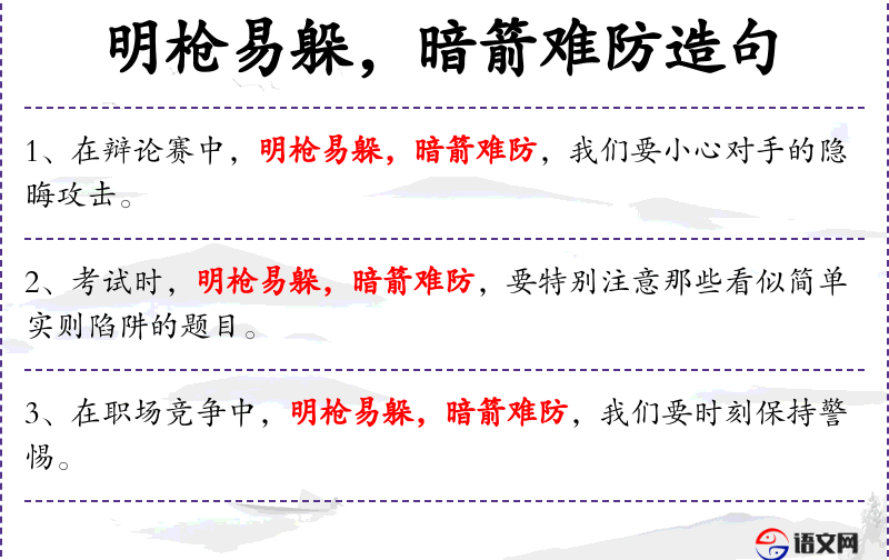 句子中的“明枪易躲,暗箭难防”是传统文化中的成语,源自古代战争的比喻,用于形容明显的危险容易避免,而隐藏的危险则难以防范。这个成语反映了人对于人际关系和社会互动的深刻理解。