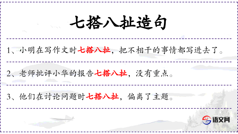 - 七搭八扯:形容词性短语,形容讨论杂乱无章,没有重点。