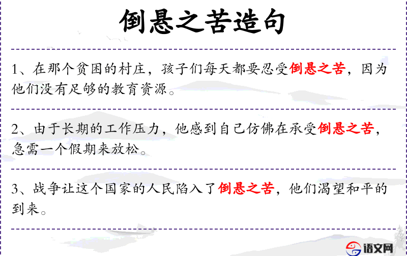 句子中的“倒悬之苦”是一个比喻,源自**古代的刑罚“倒悬”,用来形容极端的痛苦。这反映了中文中常用比喻来增强表达效果的特点。