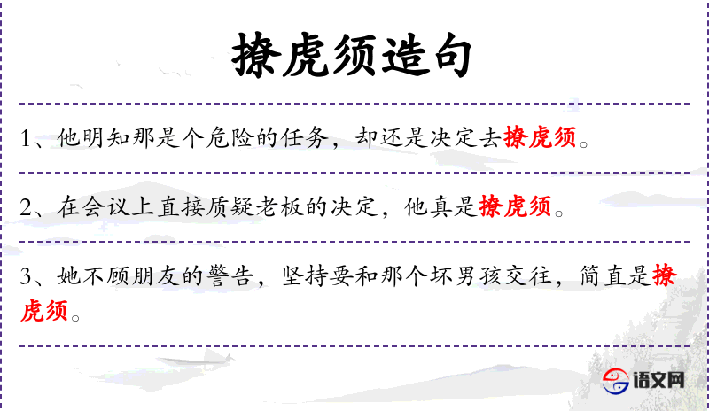 - 撩虎须:成语,比喻冒险或挑衅危险的事物。