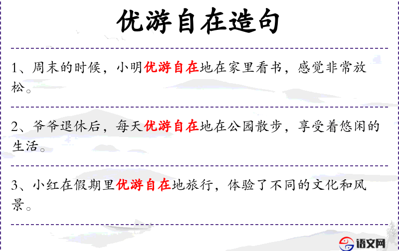 - 优游自在:形容词短语,表示轻松自在、无忧无虑的状态。
