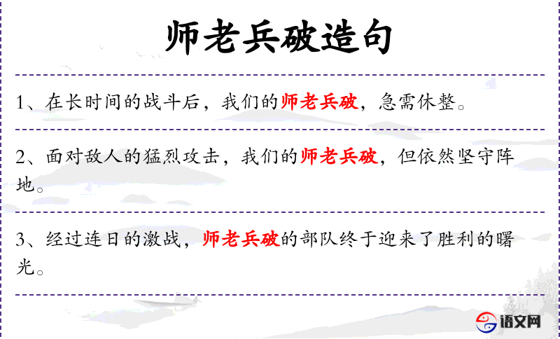 - 师老兵破:形容士兵们经历了长时间的战斗,疲惫不堪,破败不堪。