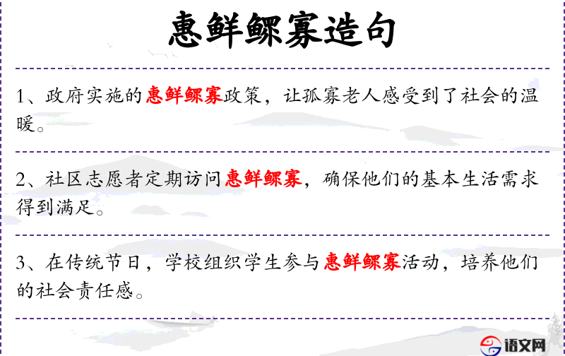 - 惠鲜鳏寡:帮助孤寡老人,源自《孟子·梁惠王下》。