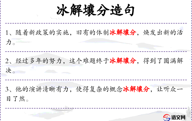 - 冰解壤分:成语,比喻问题或困难被彻底解决。