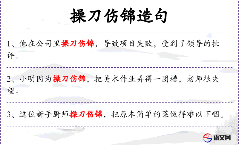 - 文化意义:“操刀伤锦”这个成语原本指的是在处理精细物品时不小心造成损坏,这里比喻学生在处理美术作业时不小心造成了不良后果。