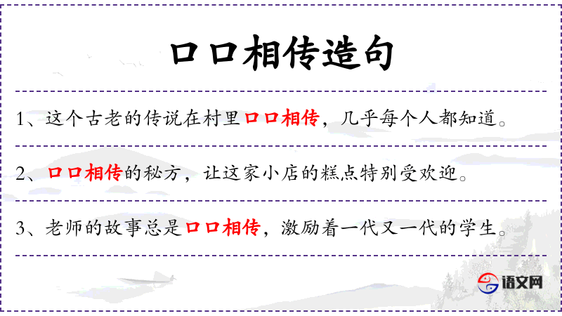 - 可以尝试用不同的句式表达相同的意思,例如:“一代又一代的学生被老师的故事所激励,这些故事通过口口相传的方式流传下来。”
