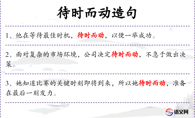 句子中的“待时而动”和“不急于一时”都是文化中常见的成语,强调在面对机会时要冷静和有策略。这些成语反映了文化中对耐心和策略的重视。