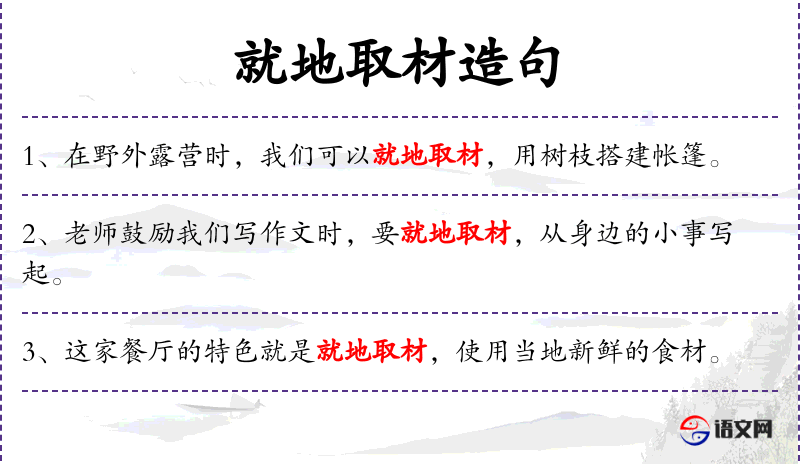 - 宾语:“就地取材,使用当地新鲜的食材”