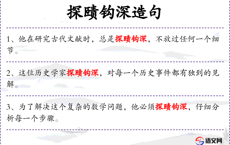 句子:“这位历史学家探赜钩深,对每一个历史**都有独到的见解。”