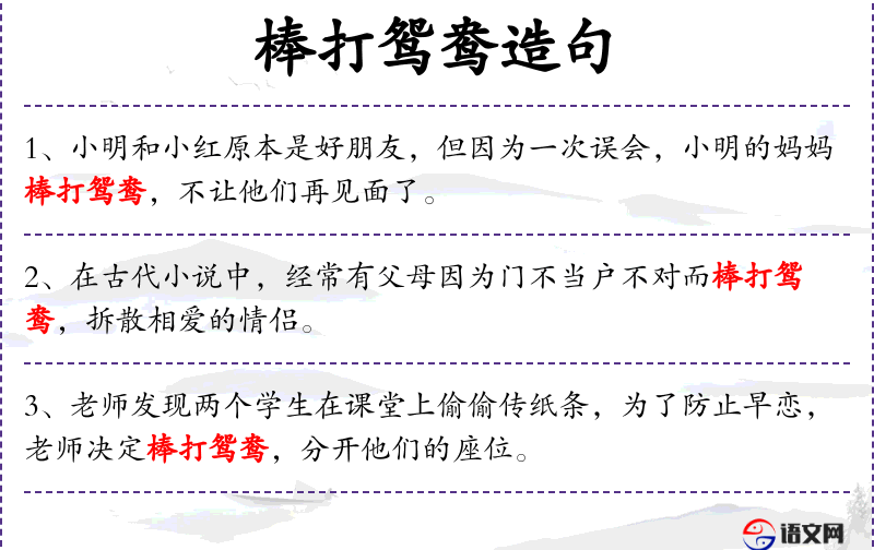 9. 【棒打鸳鸯】 用木棒打散一双鸳鸯。比喻拆散恩爱的夫妻或情侣。
