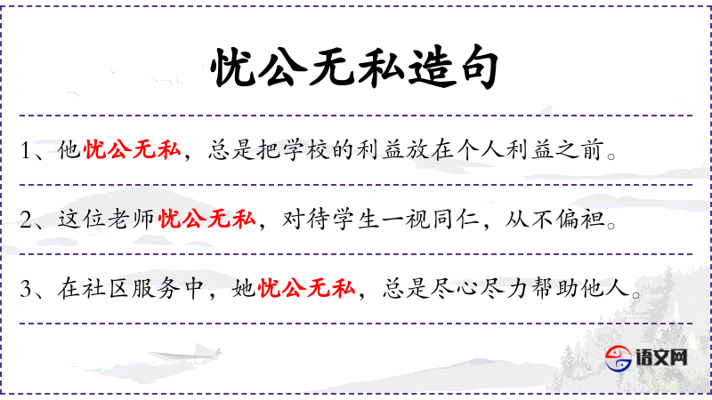 - 忧公无私:成语,形容人关心公共事务,不考虑个人利益。