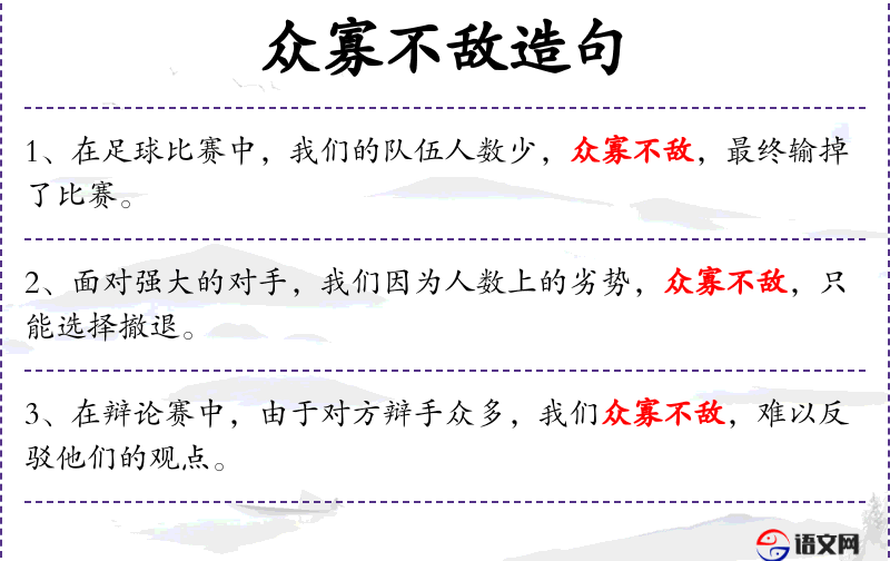 句子中“众寡不敌”是一个成语,源自**古代兵法,意指在战争中人数少的一方难以对抗人数多的一方。这个成语在现代汉语中常用来比喻在竞争中处于劣势。
