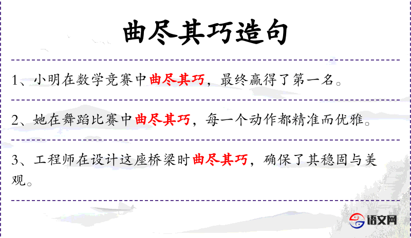 3. 【曲尽其巧】 曲:委婉细致。曲折而委婉地将其中的奥妙之处充分表达出来。