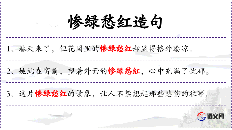 “惨绿愁红”可能源自古典文学,用来形容秋天的景色,带有浓厚的文化色彩。这种表达方式在文学中常见,用来描绘季节变化带来的情感变化。