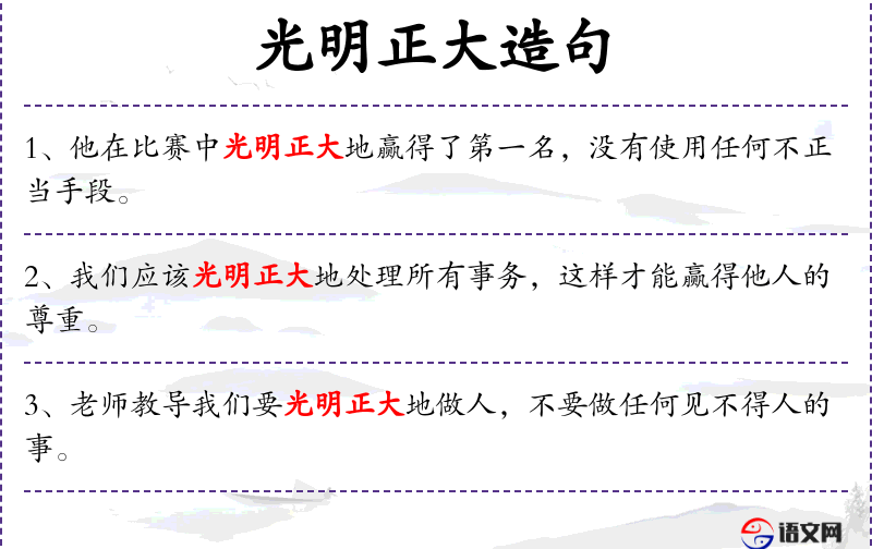 - 光明正大:形容做事公开,不隐瞒,不欺骗。