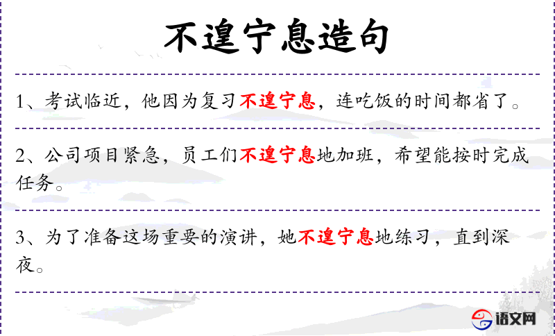1. 【不遑宁息】 - 没有闲暇的时间过安宁的日子。指忙于应付繁重或紧急的事务。同“不遑宁处”。