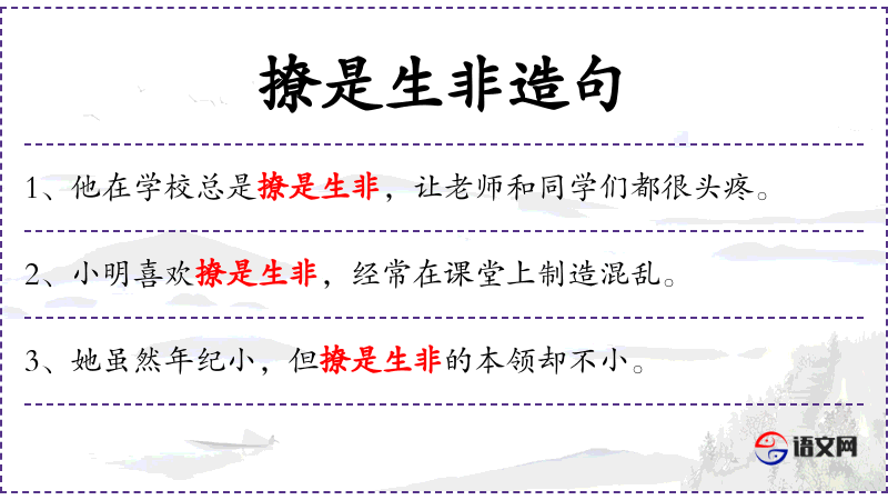 - 撩是生非:成语,意思是挑起事端或制造麻烦。