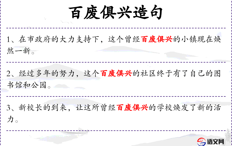 1. 【百废俱兴】 俱:全,都。许多已经荒废了的事情一下子都兴办起来。